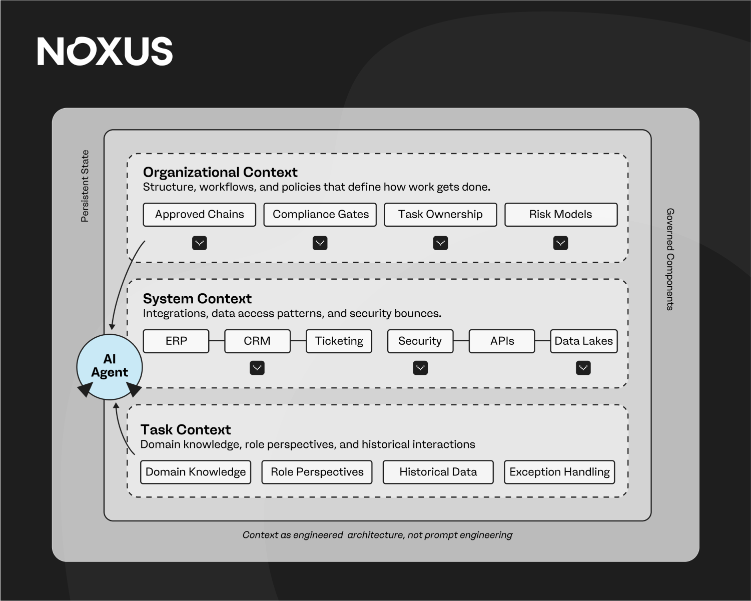 Noxus was engineered with context as a first-class requirement. Our three-layer architecture embeds contextual awareness from workflow design through to execution at scale: