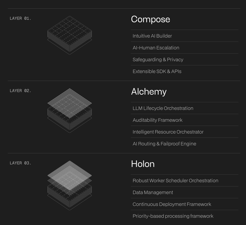 - Alchemy layer: Manages the orchestration and lifecycle of models with context-rich routing, retrieval, and optimization. Dynamic model routing, failover strategies, and RAG pipelines ensure every decision is made with the most relevant and up-to-date information available.