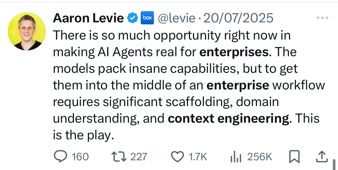 Aaron Levie, CEO of Box, adds, “To get [AI agents] into the middle of an enterprise workflow requires significant scaffolding, domain understanding, and context engineering. This is the play.”