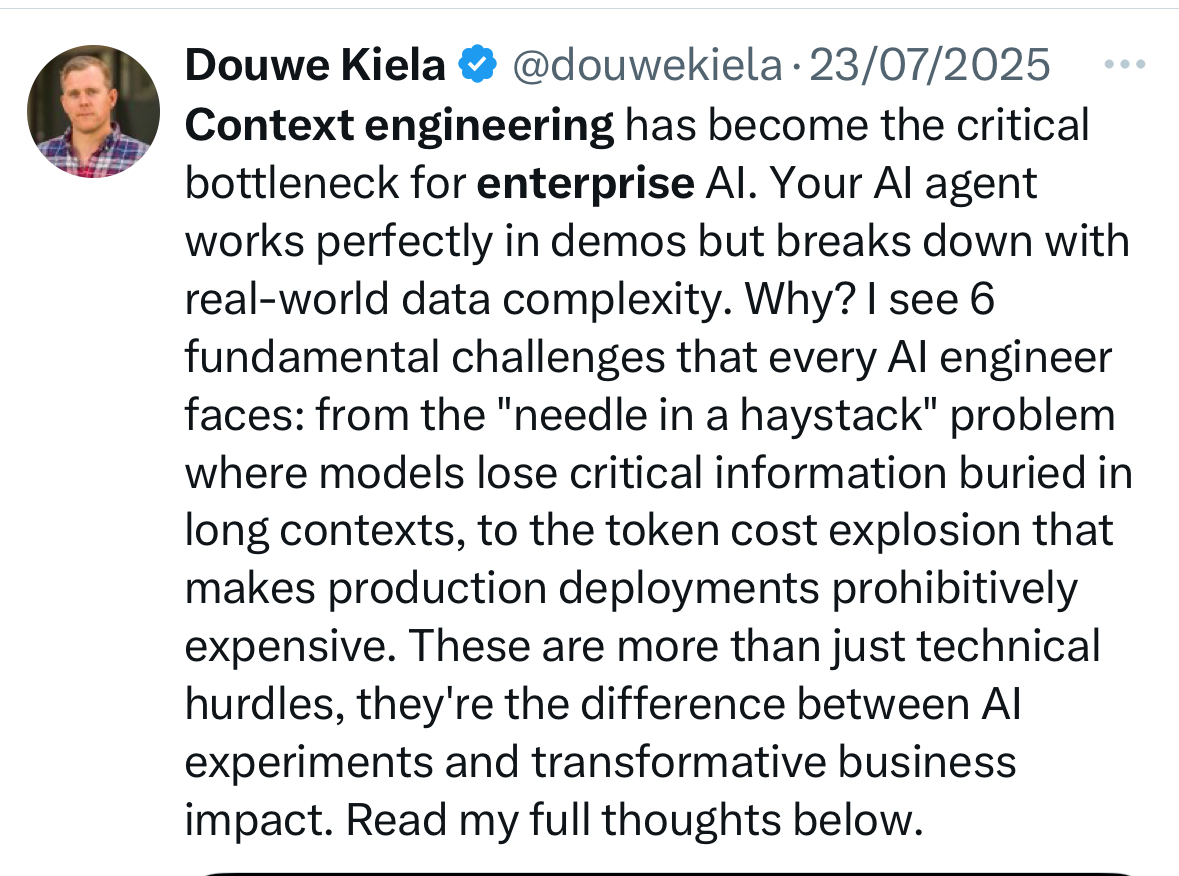 The move from AI agent prototypes to production deployments has sparked a clear theme in technical circles: context is the infrastructure that makes agents viable in the enterprise. As Douwe Kiela, CEO & Co-founder of Contextual AI, puts it, “Context engineering has become the critical bottleneck for enterprise AI… The difference between AI experiments and transformative business impact.”
